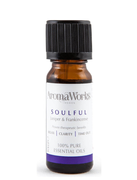 Experience blissful relax with the organic Aromaworks Soulful Essential Oil that can be mixed with carrier oils for a calming massage or burned to fill the environment with calmness. The Top notes of spicy Frankincense combined with the fruity Juniper Berry provide a deeply calming sensation that soothe your mood, whilst the aromatic base notes of Patchouli ease away stress and fatigue, for a truly warming and relaxing experience.