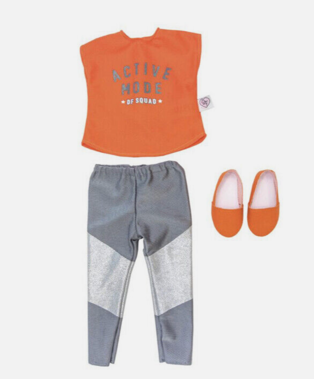 The Designafriend active outfit includes a coral short sleeved T-Shirt with 'Active Mode' printed in glitter. It also includes a pair of jersey printed leggings and coral dance shoes. Let's get active.