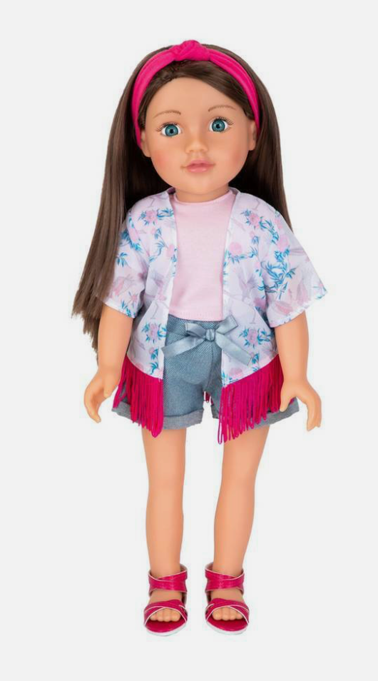 Give your Designafriend something unique and beautiful for their collection with this stunning Kimono outfit. It includes a pink T-Shirt, knotted pink headband, denim shorts with bow detail and the printed chiffon kimono with tassels. The outfit is topped off with pink leatherette sandals, giving your Designafriend pals a great, stylish look for the most sophisticated of occasions.