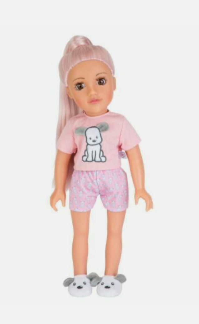 Cuter than any puppy, this pretty puppy pyjama set is great for your next Designafriend sleepover. The set gives you a pink T-Shirt with an embroidered puppy face, puppy print shorts and soft velboa puppy slippers. It's so cosy your dolls will be ready for a night in on their own or a sleepover with their Designafriend pals.