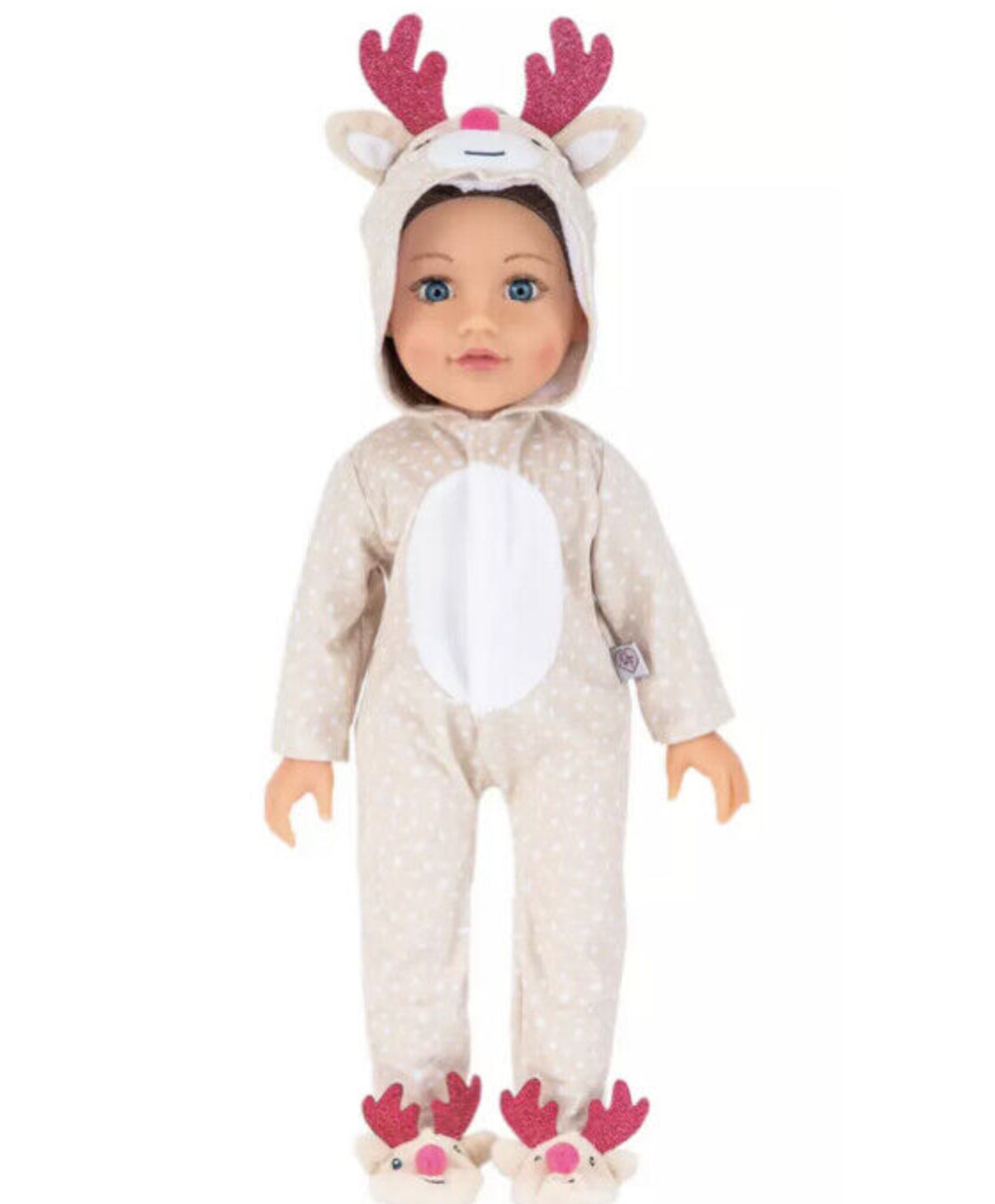 The perfect outfit for some festive sleepover fun with your DesignaFriend besties! The DesignaFriend reindeer All-In-One Outfit includes a reindeer all-in-one with hood which features a cute embroidered reindeer face, 3D ears, and red glitter antlers. The all-in-one also includes built in slippers with a cute reindeer face and matching ears and red glitter antlers. Each outfit comes with a unique charm for your bracelet.