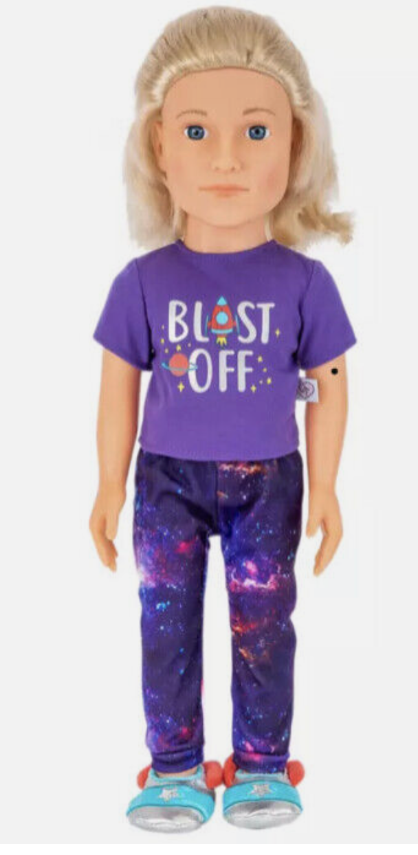 Now your boy DesignaFriend bestie can join in the sleepover fun! The DesignFriend Space Boy Pyjama Outfit includes a purple short sleeved 'Blast Off' tee, galaxy print pyjama bottoms and rocket shaped slippers with 3D rocket wings and flames. Each outfit comes with a unique charm for your bracelet.