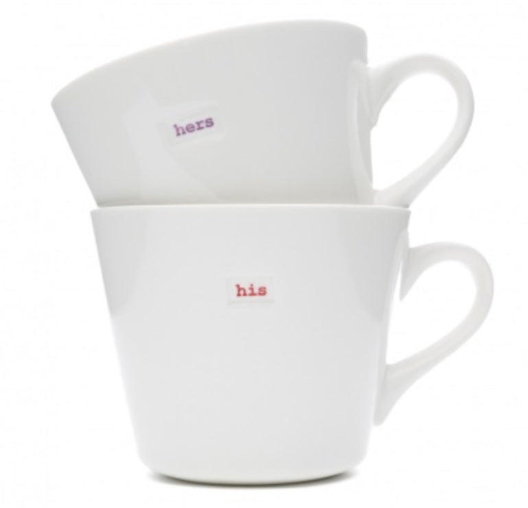 Hand-finished Keith Brymer Jones authentic standard Bucket Mug pair (350ml) with his hers carefully pressed & hand-coloured for a uniquely crafted piece of stylish homeware. Part of the Keith Brymer Jones Word Range.