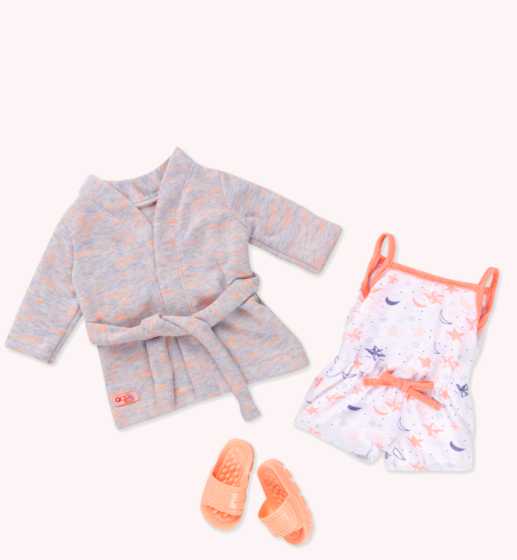 This lovely pajama and robe outfit for 18-inch dolls is perfect for a summer sleepover, a day lounging and reading, and for all kinds of sweet dreams! The one-piece pajama romper has a pretty moon and star print that are sure to encourage a great night for your sleepyhead dolls, and the easy-open closure in the back to makes it simple to dress your dolls for bedtime. The matching robe is made of a soft and cuddly material and has a tie-belt to help keep it on. Peach-colored flip-flop sandals are the perfect summer slippers and will keep your doll’s toes off the floor! This cozy outfit is sure to help a few dreams come true for your dolls!