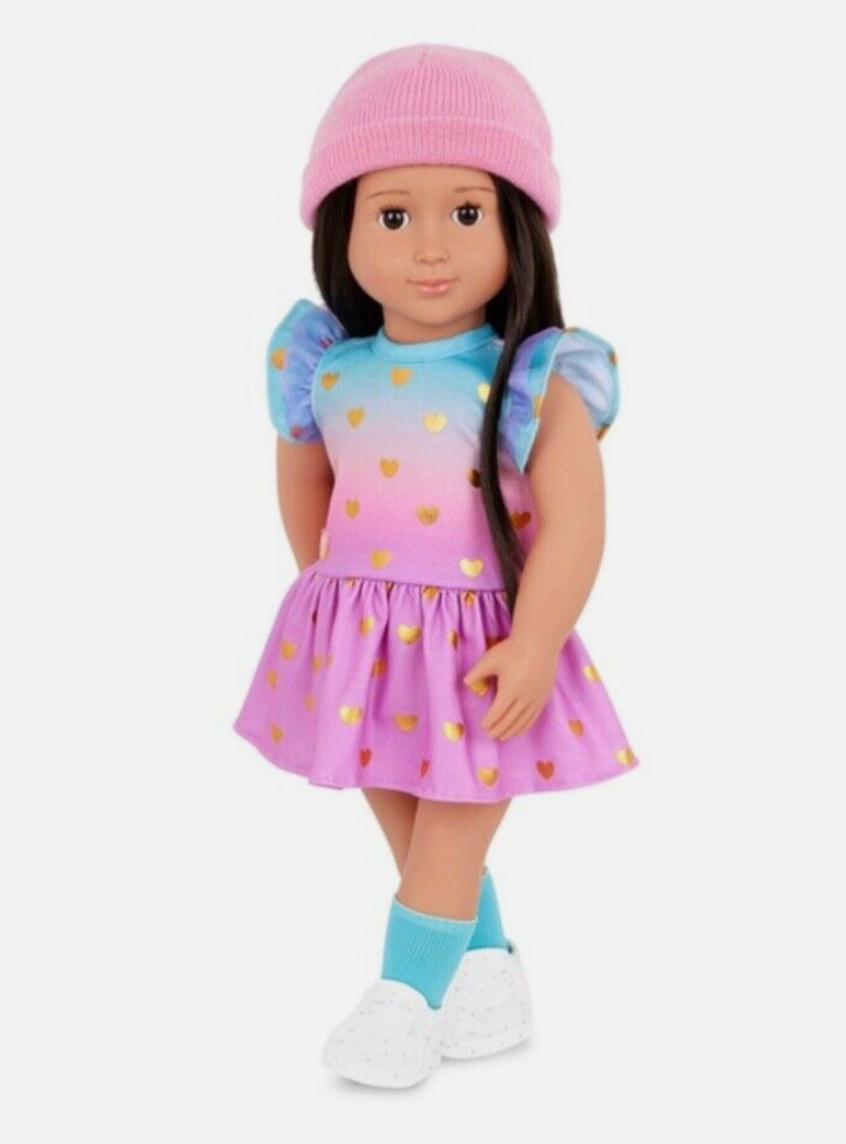 - Contents: 1x Heart-print dress, 1x pair of bright blue socks, 1x pink beanie hat, and 1x pair of sneakers