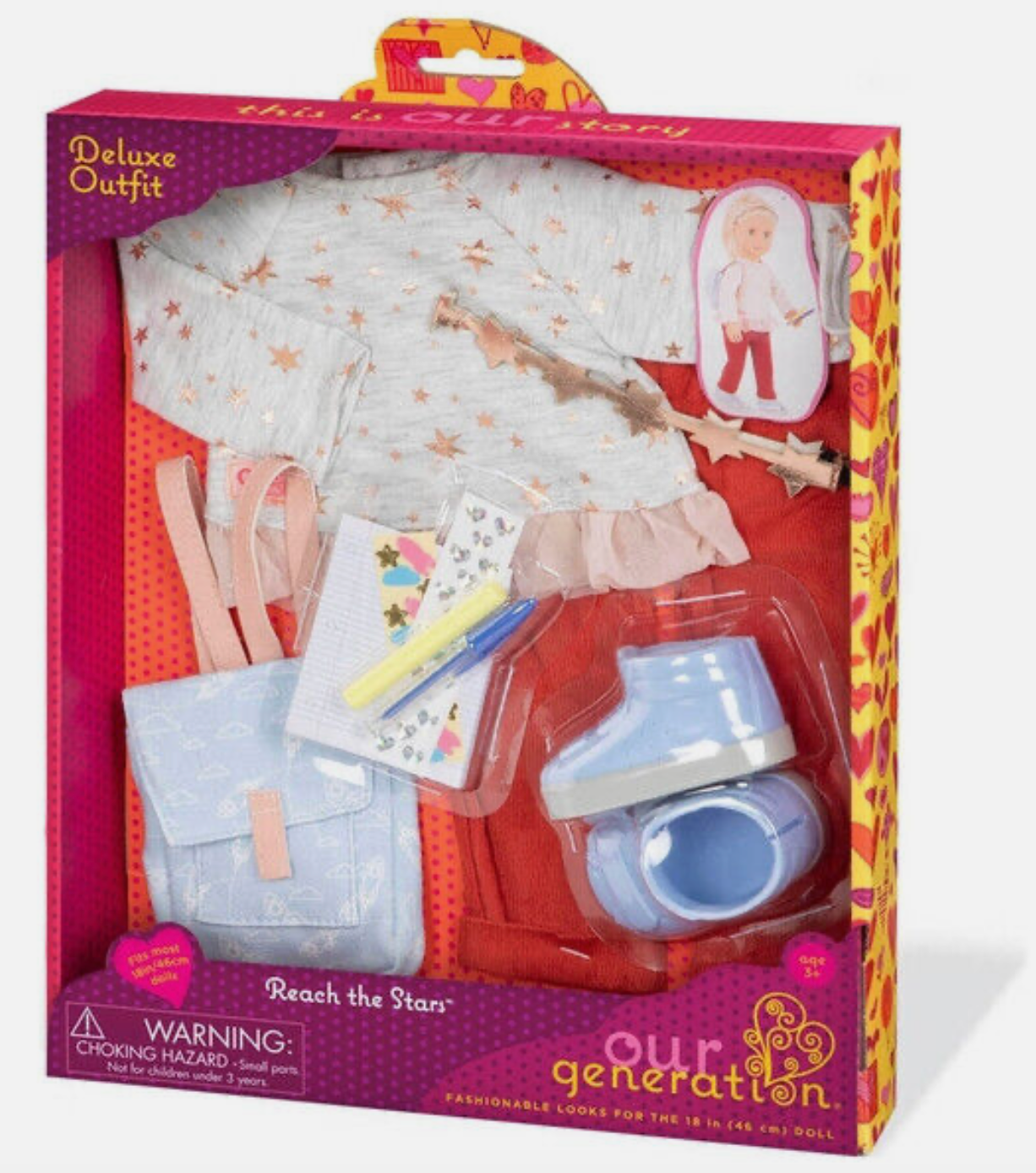 Help your dolls set goals, do their best, and accomplish anything they set their minds to with the Reach the Stars Deluxe Outfit from Our Generation! This deluxe outfit set will bring both kids and their 46cm tall dolls a galaxy of fun.