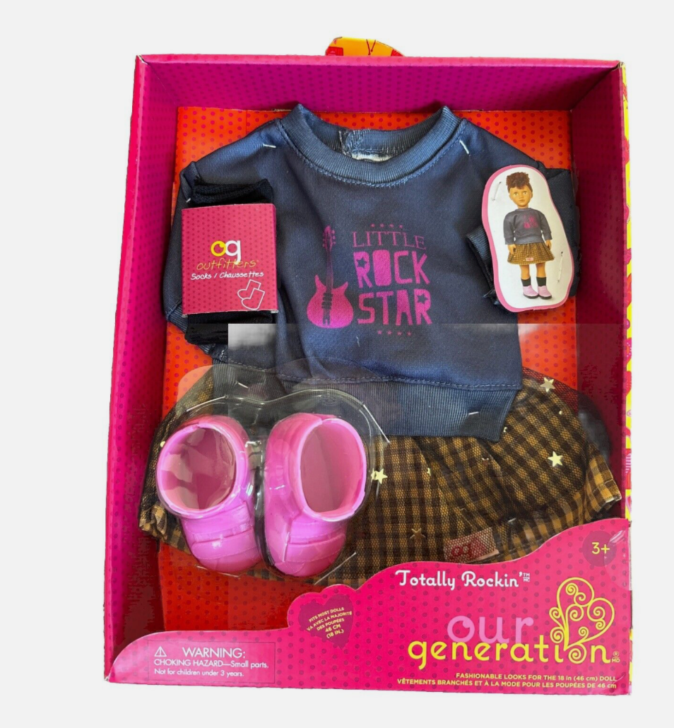 Bring out the rock star in your little one with the Our Generation Totally Rockin Outfit. This 18-inch doll playset features a cloth and plastic outfit with a character that's totally cool. The set includes a doll with varying hair types and colours, and a complexion that adds to her unique charm.