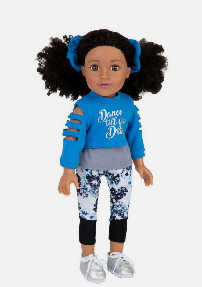 Sisi measures 18 inches/46cm tall and wears a blue cropped sweatshirt with silver glitter print 'Dance till you drop', grey vest top, leggings with mesh fabric detail, and silver trainers. She has curly hair which comes styled with scrunchies.